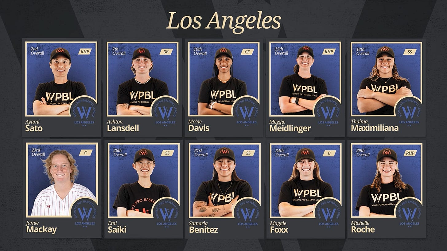Our team order was a little different, but we got four picks exactly right: I had RHP Kelsie Whitmore at #1 overall (an easy choice), Max Chase went with RHP Ayami Sato at #2, Kate Nowlin had RHP Alli Schroder at #5, and Mary Mustard took C Denae Benites at #6. 3B Ashton Lansdell and SS Samaria Benítez ended up in Los Angeles. We also correctly pegged 3B Kylee Lahners, RHP/UTL Jill Albayati, RHP Meggie Meidlinger, LF Lexi Hastings, and CF Mo’ne Davis as top 20 picks.
