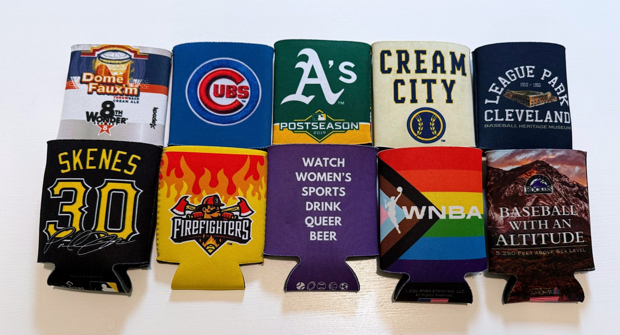 I enjoy collecting them as they’re usually a very approachable price point if I want to bring a souvenir back but don’t want to break the bank. They can be a great conversation starter too – anyone who picks up the League Park koozie you see in the top right gets to hear about our unexpectedly amazing time we had visiting the historic ballpark, for example. It’d be cool to see koozies with the WPBL logo, plus one with each of the new teams’ branding.