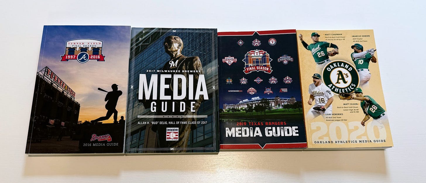 I used to collect these books. (Heck, my face was even in a few of them back when I worked for the Milwaukee Brewers and Oakland A’s.) A media guide is a comprehensive publication about a sports team, complete with franchise history, player statistics, and background information on everyone in the organization. Click here to see an example of the 2025 Chicago Cubs media guide and Pete Crow-Armstrong’s player page.